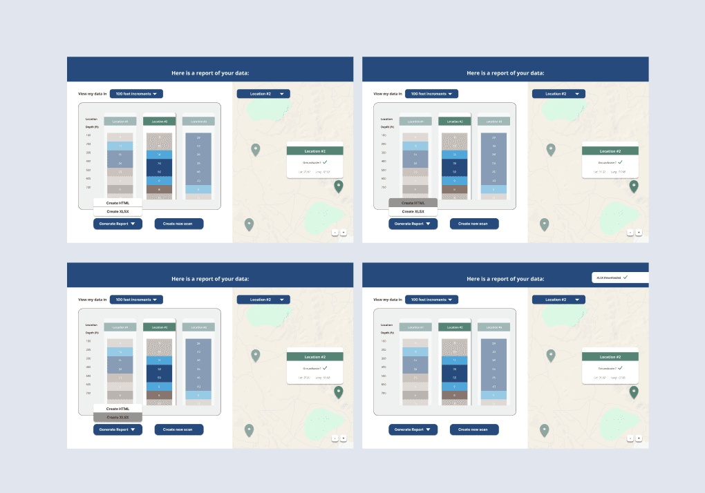 Solution: Replaced the existing spreadsheet-style results format with an interactive map view using location pins and an intuitive color coding system, similar to familiar tools like Google Maps. Colors communicate water viability at a glance, so users can orient themselves spatially and make faster, more confident decisions about where to drill.